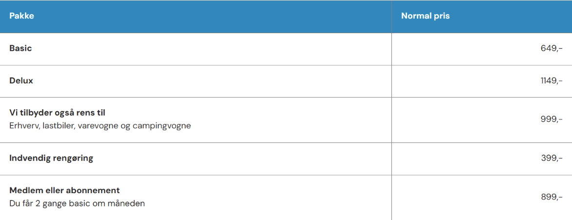 Prisen for indvendig bilrengøring afhænger af bilens størrelse, snavs og eventuelle tillægsydelser. Vi tilbyder konkurrencedygtige priser på vores deluxe-pakke og basispakke. Se priserne på pakkerne her: